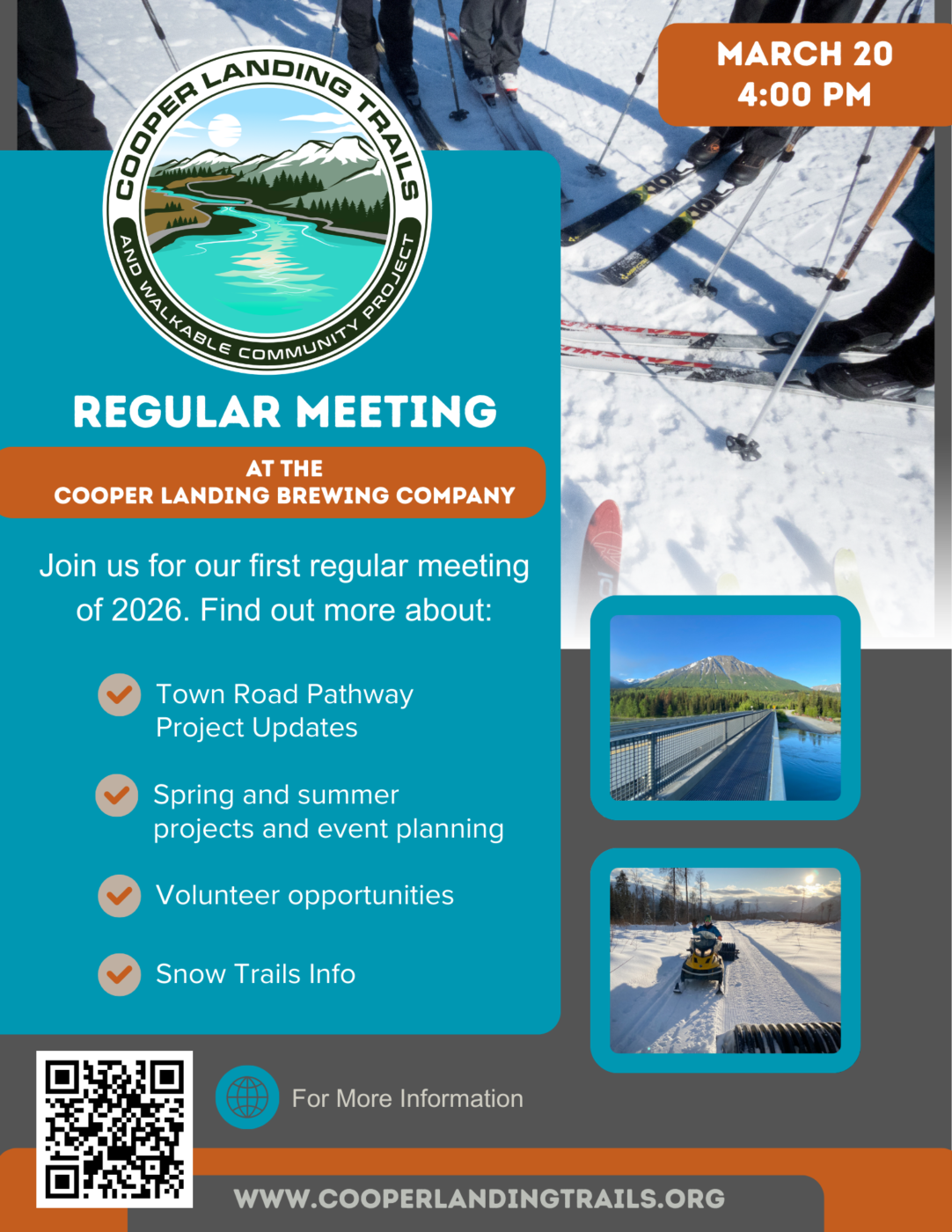 Join us at the Cooper Landing Brewing Company at 4:00 pm Friday March 20 for our first regular meeting of 2026. We will give updates on snow trails and the Town Road pathway. We will also discuss spring and summer projects and related volunteer opportunities.